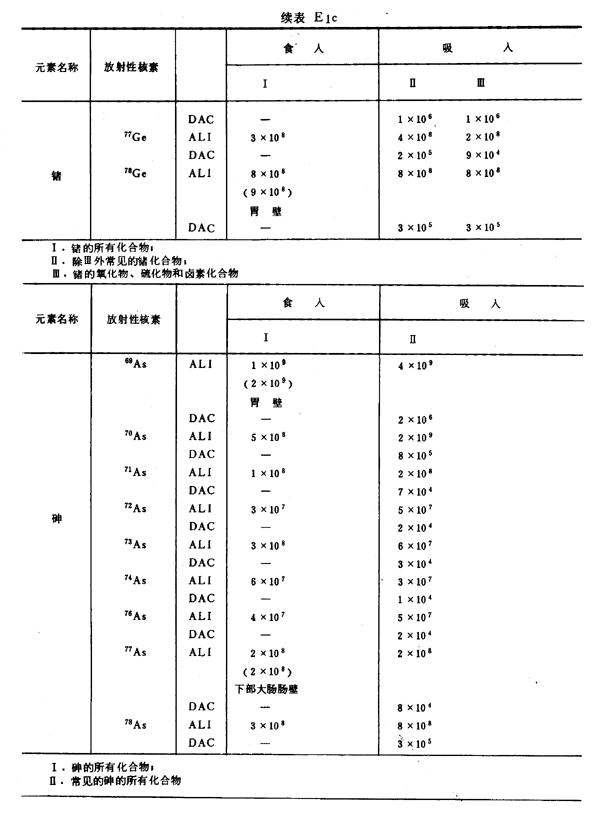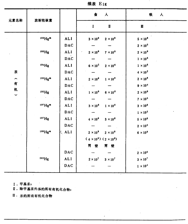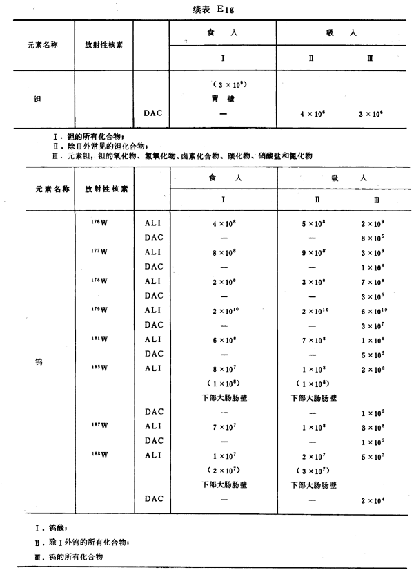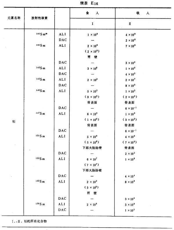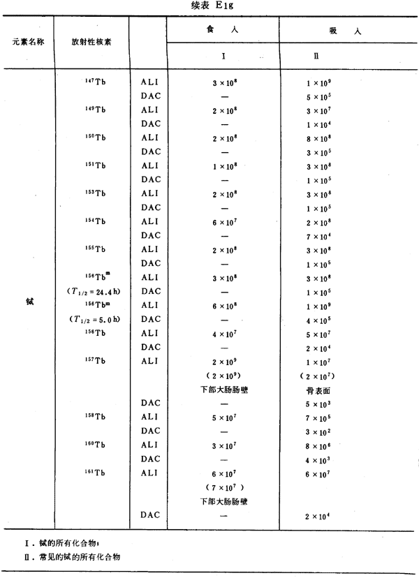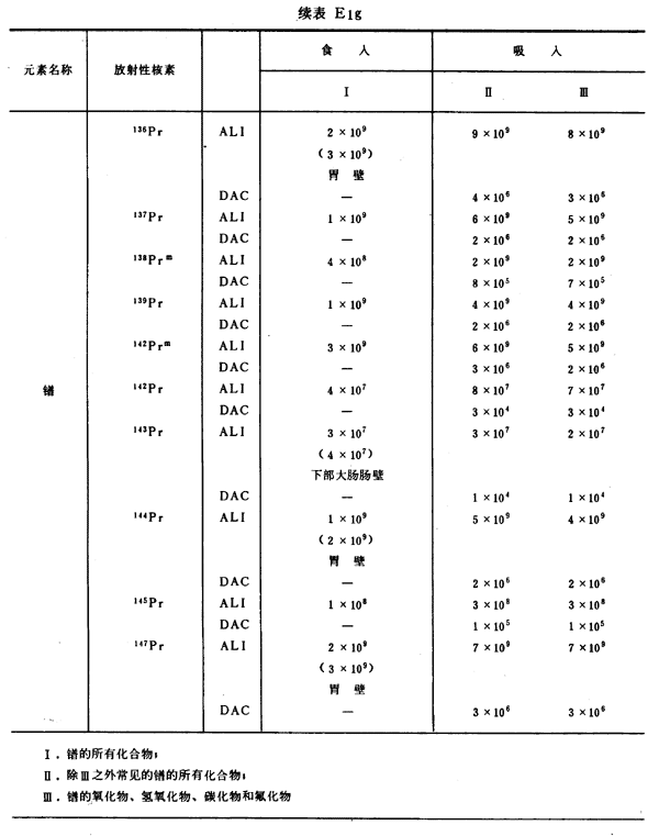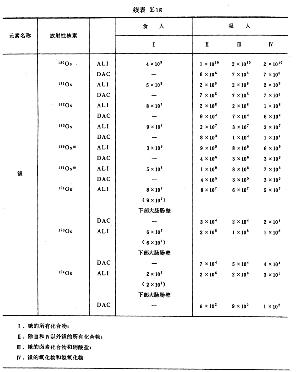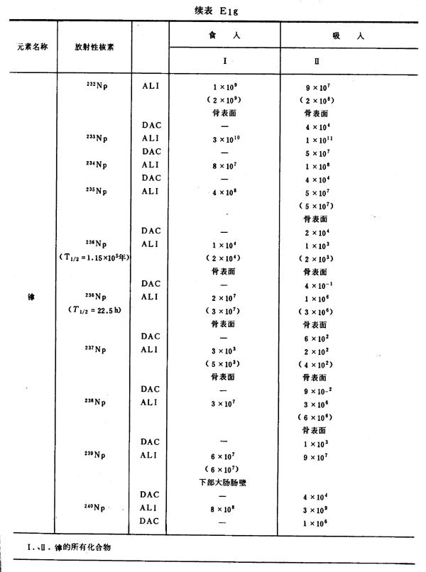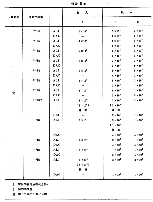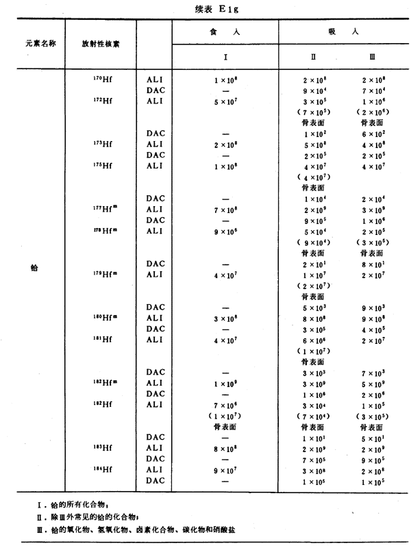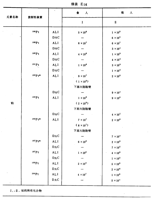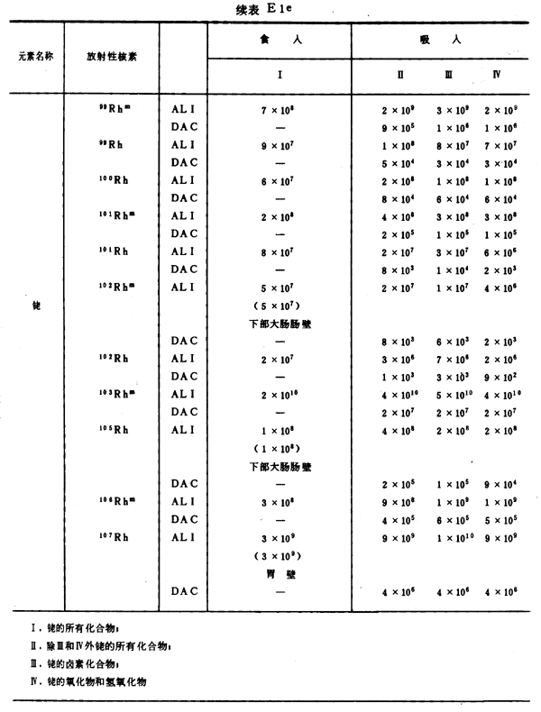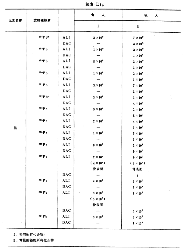 E8 表E1a~E1g中給出每一元素的各個(gè)核素的年攝入量限值A(chǔ)LI(Bq)和導(dǎo)出空氣濃度DAC(Bq/m