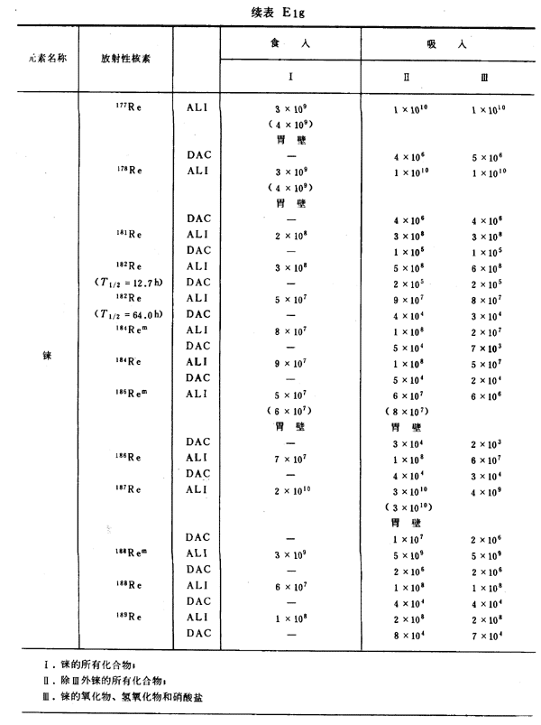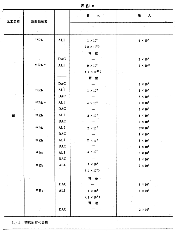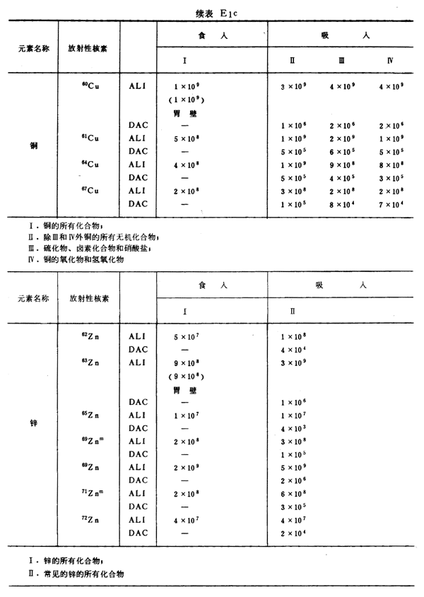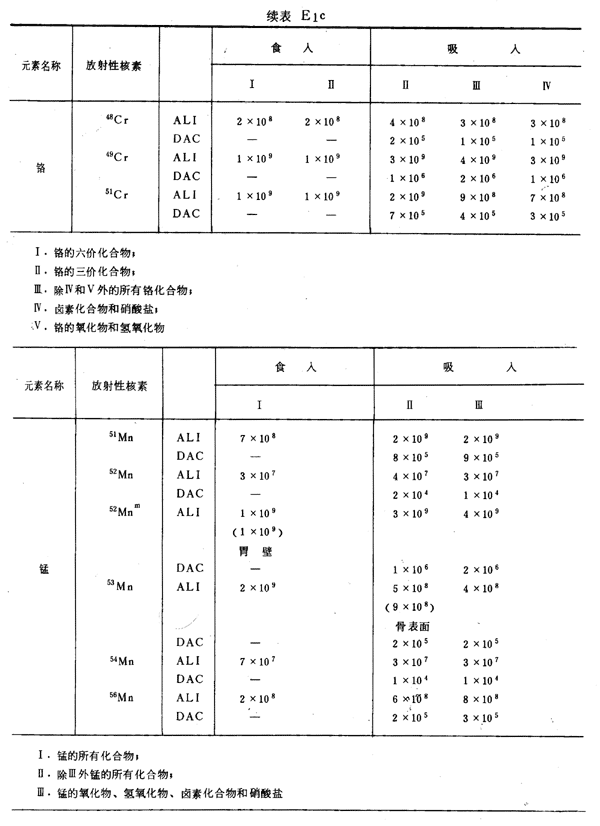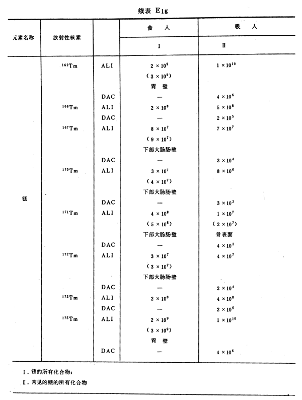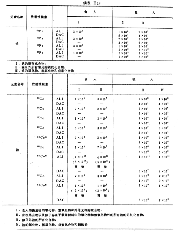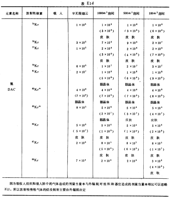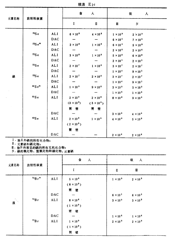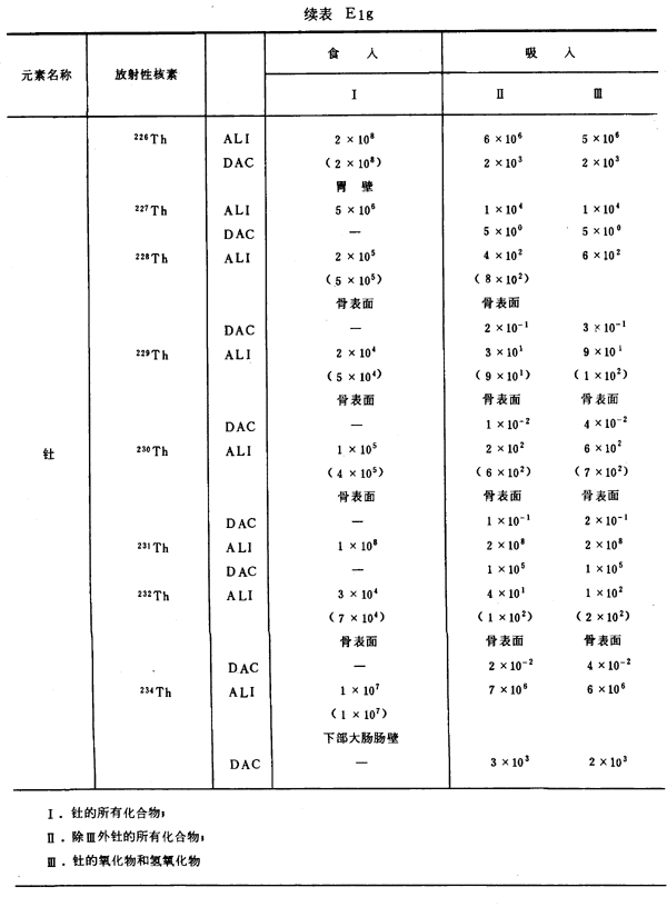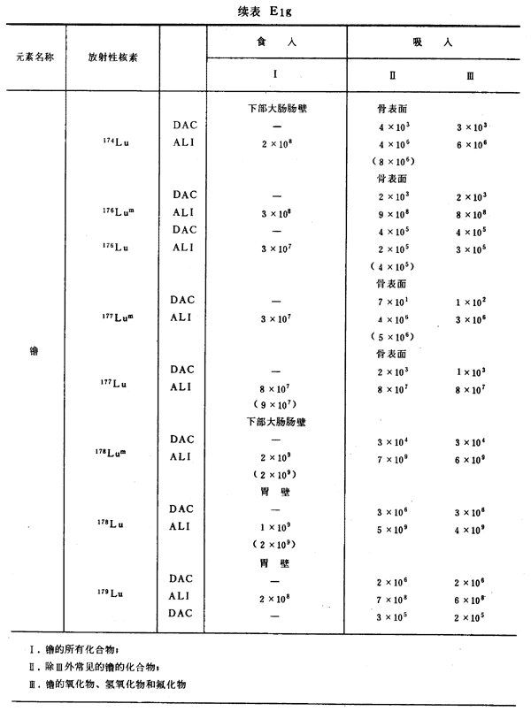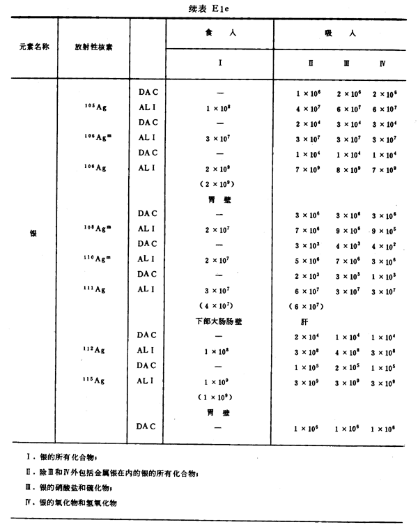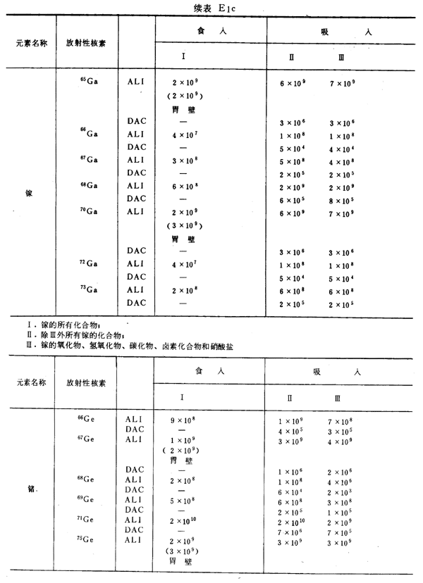 E8 表E1a~E1g中給出每一元素的各個(gè)核素的年攝入量限值A(chǔ)LI(Bq)和導(dǎo)出空氣濃度DAC(Bq/m