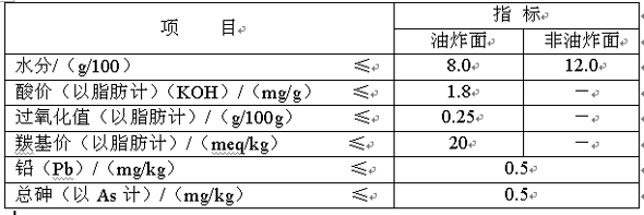 本標準適用于以小麥粉、蕎麥粉、玉米粉、綠豆粉、米粉等為主要原料,添加食鹽或食品添加劑等,加適量水調制、壓延、成型、汽蒸后,經油炸或干燥處理,達到一定熟度的方便食品。