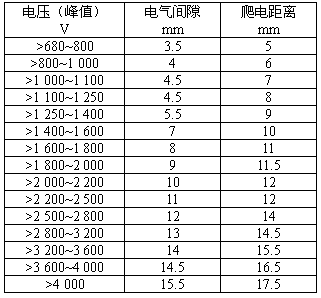 在電壓高于480V(峰值680V)的電路中,不同電位的帶電部件之間以及帶電部件與易觸及金屬部件之間的爬電距離和電氣間隙,應不小于下表所規定的數值。