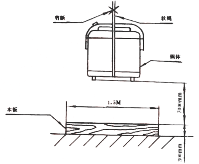 在表面平整的混凝土地面上,水平放置大小約1.5m×1.5m,厚度為30mm的干松木板,對(duì)準(zhǔn)木板中央部分,使鍋底面與板面平行,將鍋體從700mm高處剪斷所系繩子跌落一次。