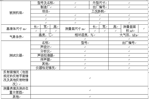 d. 反射平面上自由聲場測試還應記錄基準體尺寸、測量表面的尺寸和表面積及按附錄A確定的環境修正值K。
