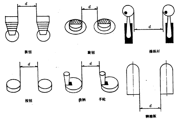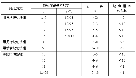 5.1.6 用手掌按壓操作的操縱器的表面要有球面凸起形狀,用手指按壓的表面要有適合指形的凹陷輪廓。按鈕的水平截面應為圓形或矩形,按鍵應為矩形。矩形按鈕和直徑在3~5mm的按鈕可做成球面或平面形狀,若為編碼的需要允許制成其他形狀(見圖3)。