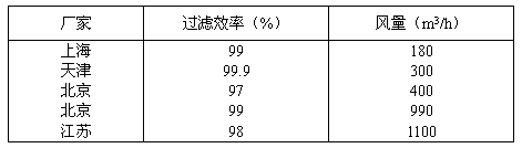 2. 在標準中,我們將凈化器的過濾效率分為三級,分別為一級99.5%,二級98.5%,三級97.5%。這主要是根據(jù)日本標準及我們所進行的試驗結(jié)果,并依據(jù)我國勞動場所衛(wèi)生標準中所規(guī)定的粉塵濃度而確定的。在《工業(yè)企業(yè)設計衛(wèi)生標準》中,規(guī)定車間空氣中有害物質(zhì)的最高容許濃度為:玻璃棉和礦渣棉粉塵5mg/m3。我國目前均把焊接煙塵列為上述標準中“其它粉塵”,取焊接煙塵最高容許濃度為10mg/m3,因此為了使焊工能在施焊過程中吸入的空氣符合衛(wèi)生要求,根據(jù)我國現(xiàn)有產(chǎn)品實際情況及不同工作環(huán)境、濃度等因素,我國將過濾效率按1%的級差分為三級。表1為幾個廠家產(chǎn)品的性能參數(shù)。