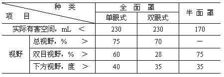 注:全面罩內設口鼻罩時,實際有害空間應小于170mL;用于定量供氣式,送風機式面具的面罩,實際有害空間允許增加20%。