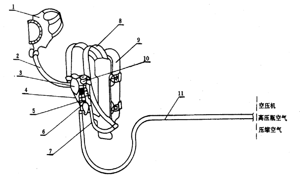 1―面罩;2―連接導管;3―供氣閥;4―減壓閥;5―止逆閥;6―軟管連接器;7―高壓裝置;8―固定帶;9―小型高壓空氣瓶;10―壓力指示器;11―中壓軟管