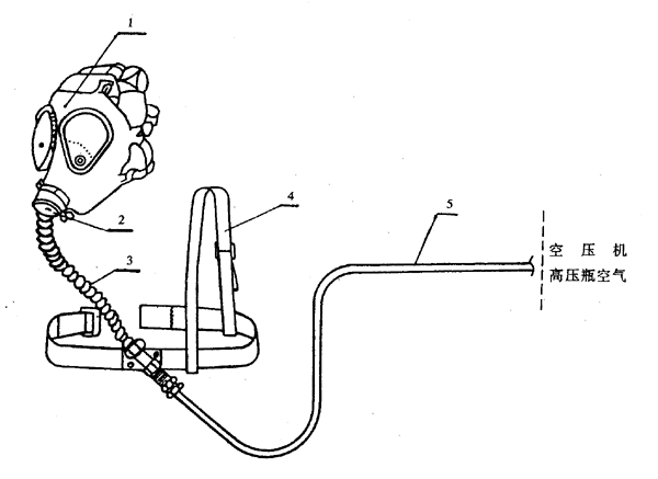 1―面罩;2―供氣閥;3―連接導管;4―固定帶;5―中壓軟管