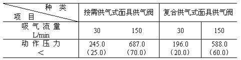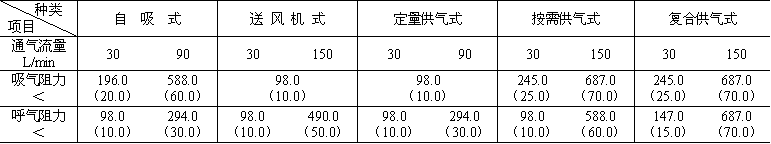 按照GB6221-86《長管面具性能試驗方法》第1章或GB2891.6-82《過濾式防毒面具面罩佩戴漏氣系統的試驗方法》試驗,并符合表2相應規定值。