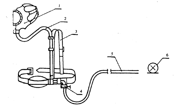 1―送氣頭罩;2―連接導管;3―流量調節器;4―固定帶;5―中壓軟管;6―過濾器