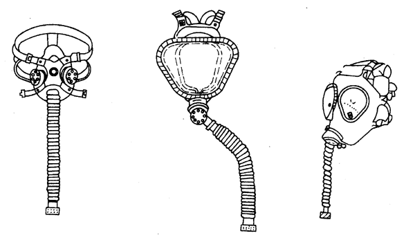 自吸式面具參見圖1,送風機式面具參見圖2,定量供氣式面具參見圖3,按需供氣式面具參見圖4,復合供氣式面具參見圖5,面罩參見圖6。