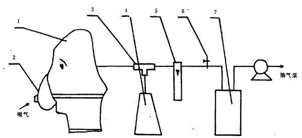 1―模擬頭型;2―被測口罩;3―三通;4―微壓計;5―氣體流量計;6―流量調節螺旋夾;7―緩沖瓶