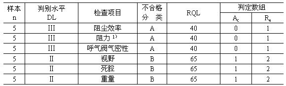7.1.1.2 檢查批量和樣本大小,防塵口罩,以每1~2d為一檢查批,最大檢查批量不超過10 000只,按GB 2828中表2的規定隨機抽取。