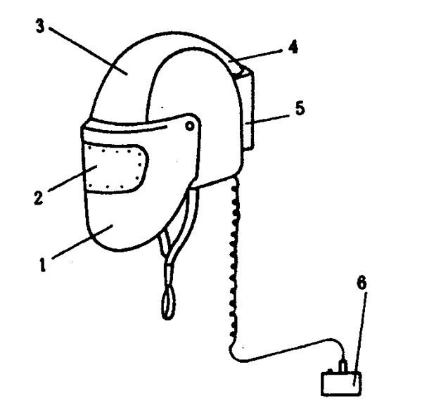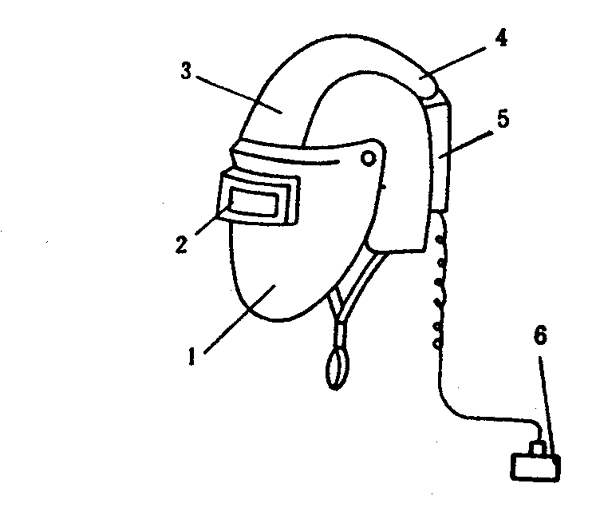 1―面罩;2―目鏡;3―帽殼;4―風機;5―過濾器;6―電池