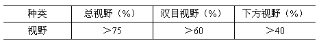4.5 一般用呼吸器護目鏡一般為無色透明材料,其可見光透過率大于85%,平均棱角度小于1/6。視野應滿足表1要求。