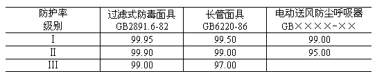 2.過濾式防毒及長管面具之泄漏率按面具種類而分級別,相當于本表三個級別。