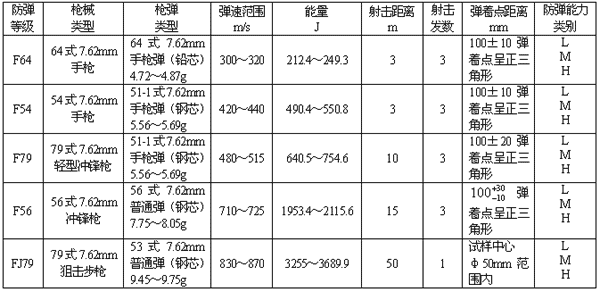6.4.1 按產品所屬防彈性能等級的要求,依表3確定槍械、槍彈類型、射擊距離。