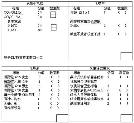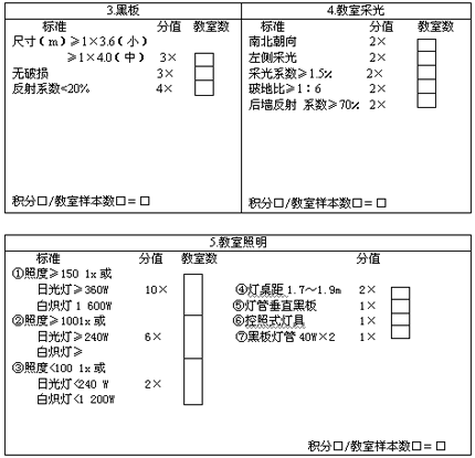 b)按評分表中課桌椅分配相符合率的標準,以及是否每人一席,將被評價的教室數填入相應的方框內,求得乘積,然后累加得積分后,再除以教室樣本數,得數為此項目得分。