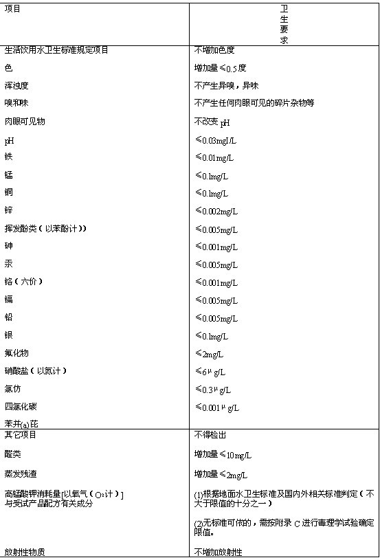 3.3浸泡水需按附錄A和附錄B的方法進(jìn)行檢測。檢測結(jié)果必須分別符合表l和表2的規(guī)定。