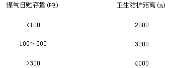 3.l煤制氣廠的衛(wèi)生防護(hù)距離,按煤氣日貯存量須符合下表:
