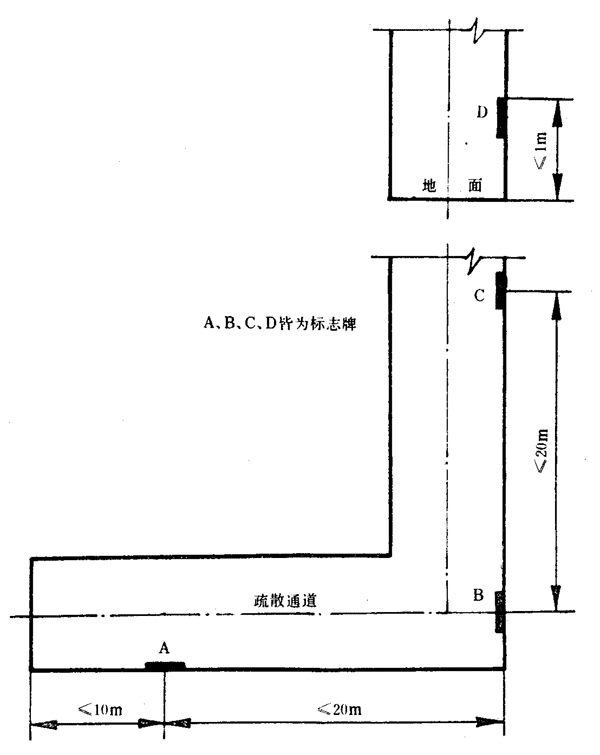 6.10.1.3如果天花板的高度較小,也可以在圖4中C、D的位置設置標志,標志的中心點距地面高度h3應在1.3m~1.5m之間。