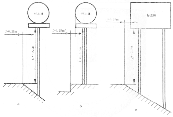 6.11.2.1設置在道路邊緣的標志牌,其內邊緣距路面(或路肩)邊緣不應小于0.25m,標志脾下邊緣距路面的高度應在1.8~2.5m之間。如圖6所示。