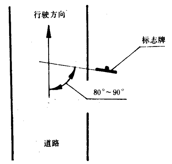 6.11.2.2設置在道路邊緣的標志牌,在裝設時,標志脾所在平面應與行駛方向垂直或成80°~90°角,如圖7所示。