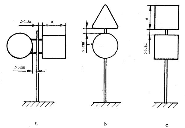 7.2.4.4兩個或多個三角形(圓形)標志牌或三角形、圓形、正方形標志牌共同設置在同一標志桿時,各標志牌之間的間隙不應小于5cm,如圖11b所示。