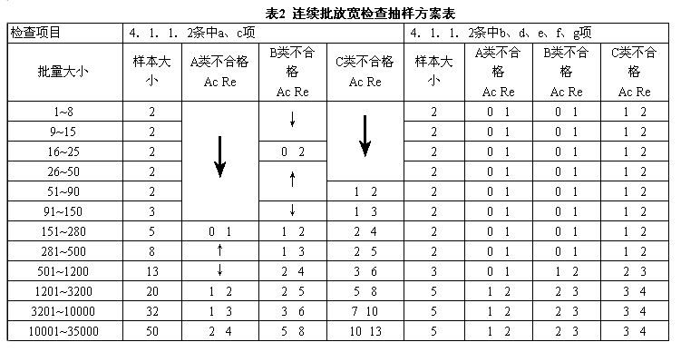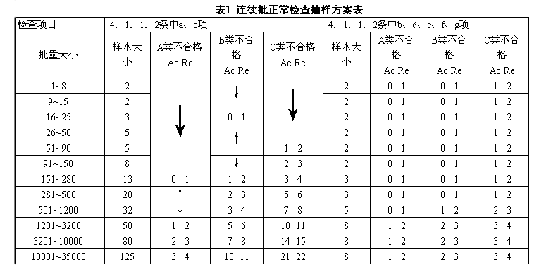 4.1.5.3 在進行放寬檢查時,如果抽樣檢查后樣本中發現的不合格數大于接收判定數Ac、小于拒收判定數Re時,接收該批,但從下一批開始必須執行正常檢查。