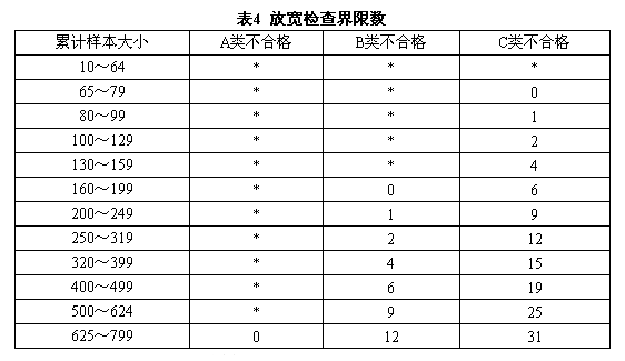 注:“*”表示累計連續十個合格批的樣本大小轉入放寬檢查不夠的,必須接著累計合格批的樣本大小直到表中有界限數可比較。