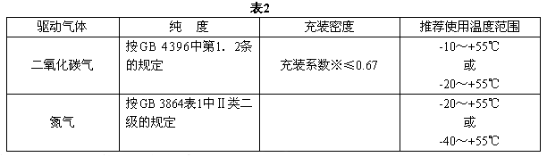 4.2.2 驅動氣體應采用二氧化碳氣或氮氣,其質量、充裝密度和使用溫度范圍應符合表2規定。