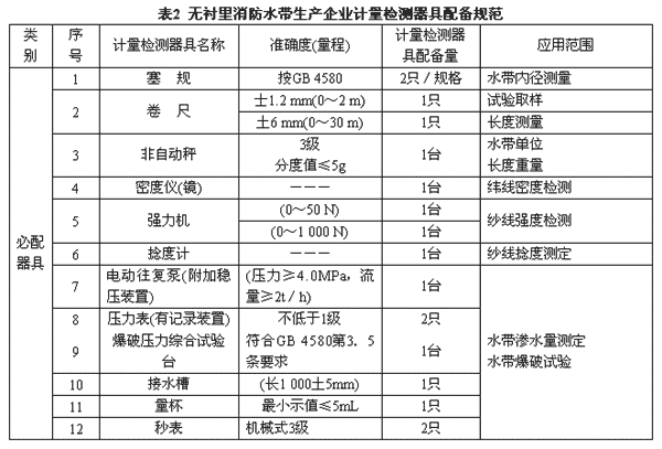 4.2 無襯里消防水帶生產企業計量檢測器具配備規范見表2。