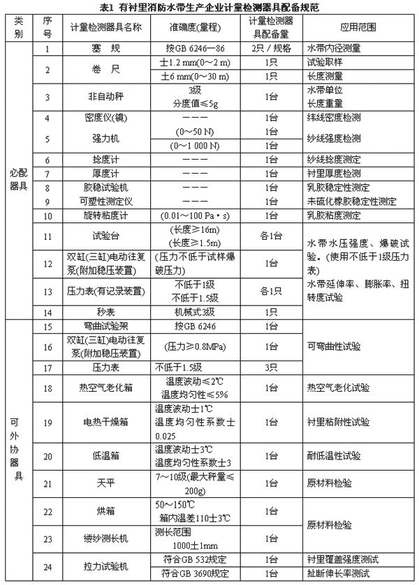 4.1 有襯里消防水帶生產企業計量檢測器具配備規范見表1。