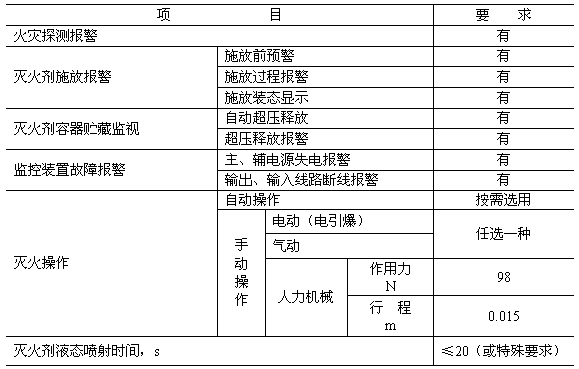 e. 用于控制滅火劑施放的容器閥和操作閥不論其為何種動力方式,也不論其可否遙控,均應能在閥旁進行就地人工操作;其供電要求:DC24 V,3A;供氣要求:啟動氣源應為不燃或惰性氣體,壓力為1.0MPa;操作用力(推力)不超過98N,行程約為15mm;