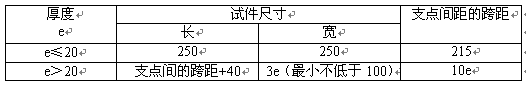 試樣厚度 e≤20mm時(shí),按圖2a)虛線所示位置從每張板截取2個(gè)試件;e>20mm時(shí),按圖2b虛實(shí)線所示位置從每張板截取4個(gè)試個(gè),試件尺寸見表7。試件在5℃以上的水中放置24h以上后,取出用濕毛巾擦去表面水珠,立即按GB8040-87中5.4和6.1.2的規(guī)定測(cè)試并計(jì)算試件的抗彎強(qiáng)度。取四次試驗(yàn)結(jié)果的平均值作為試件吸水飽和狀態(tài)的抗彎強(qiáng)度。