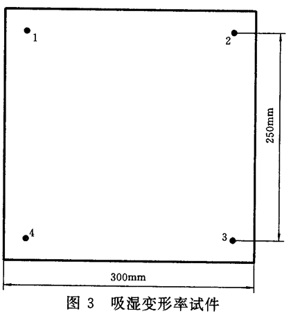 5.3.6.2試驗(yàn)與取值在經(jīng)狀態(tài)調(diào)節(jié)后的試件表面按圖3所示確定四個(gè)參考點(diǎn),參考點(diǎn)依次相距250mm。將試件浸于不低于5℃的水中24h以上,取出試件,準(zhǔn)確測(cè)量1-2,2-3,3-4和4-1之間的距離。然后將試件放于100℃~105℃的烘箱中烘至間隔2h兩次連續(xù)稱量質(zhì)量變化率不超過(guò)±1%,冷卻至室溫后,重新準(zhǔn)確測(cè)量1-2,2-3,3-4和4-1之間的距離。