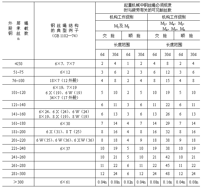 1.6 本標準適用于附錄A(補充件)所列的各種起重機械用鋼絲繩并規(guī)定其報廢標準,其目的是使起重機械的鋼絲繩在未報廢之前搬運貨物時留有足夠的安全系數(shù)。不及時發(fā)現(xiàn)鋼絲繩已達到報廢標準是危險的。