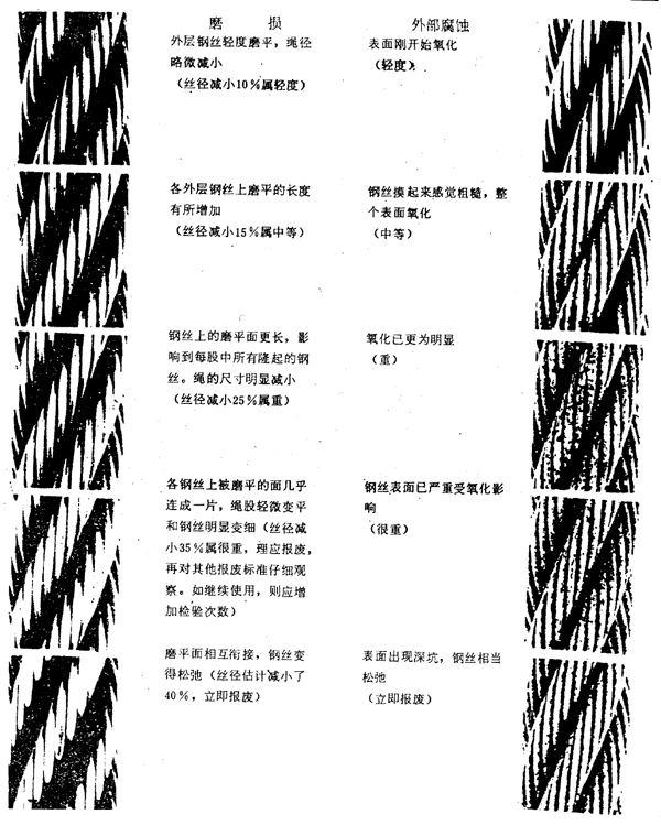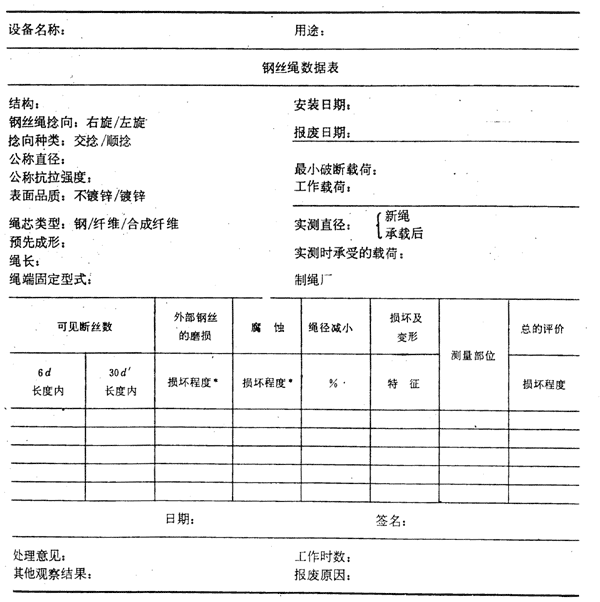 *在損壞程度一欄中這樣敘述:輕度、中等、重、很重、報廢。在外部鋼絲的磨損欄,也可用磨損的百分數(shù)來記述,如磨10%、25%等。