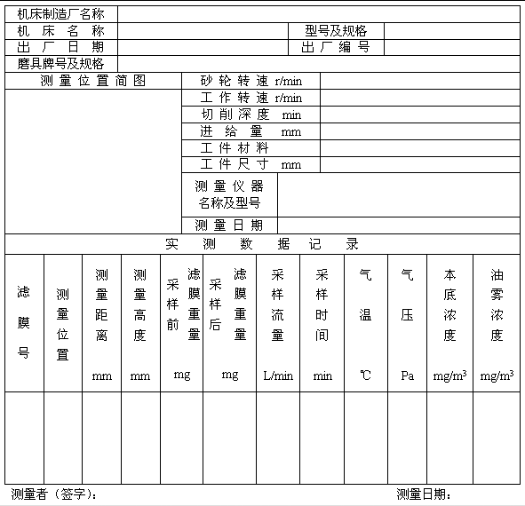 金屬切削機床油霧濃度記錄表