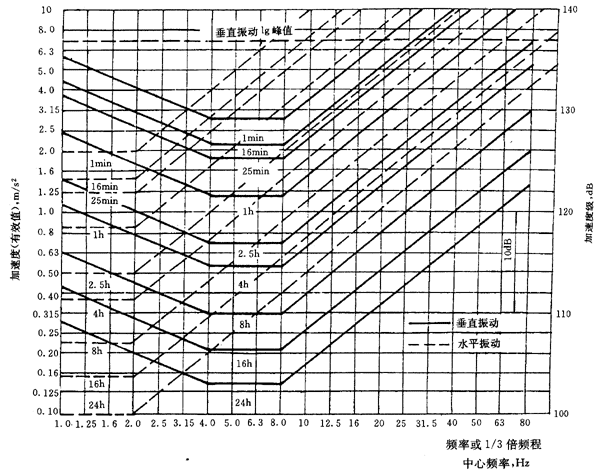 4.20 為保證車間作業人員良好工作效率的“工效界限”的振動參數不應超過圖1的值。振動容許標準的有效加速度值詳見附錄A(補充件)。