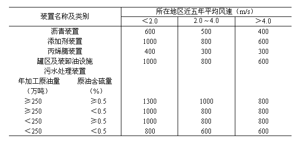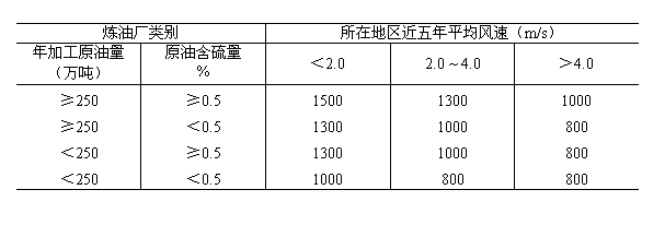 2.1 煉油廠衛(wèi)生防護(hù)距離應(yīng)根據(jù)工廠規(guī)模、原油性質(zhì)、所在地區(qū)氣象條件按表1執(zhí)行。