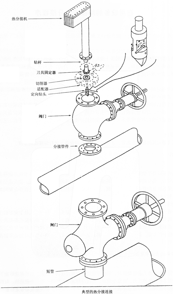 熱分接是將機制的或焊接的支線管件連接到在用的管道或設備上,并通過鉆或切割被連接的管道或設備的那一部分,在該管道或設備上產生開口的一項技術。通常是在把管道或設備從設施中脫離或用常規的方法進行吹掃和清洗是不可行時才使用熱分接。熱分接連接可以在不干擾工藝操作的情況下安全進行。
