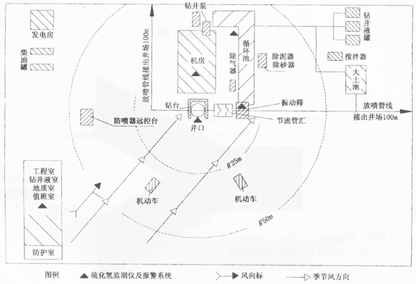 4.4 井場值班室、工程室、鉆井液室等應(yīng)設(shè)置在井場季節(jié)風(fēng)的上風(fēng)方向。