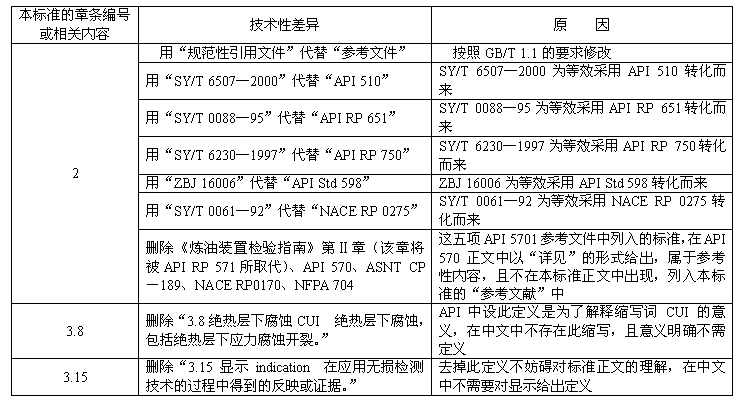 考慮到我國(guó)國(guó)情,對(duì)于A(yíng)PI 570(1998年,第二版)做了一些修改,有關(guān)技術(shù)性差異已編入正文中。在附錄B中給出了這些技術(shù)性差異及其原因的一覽表以供參考。