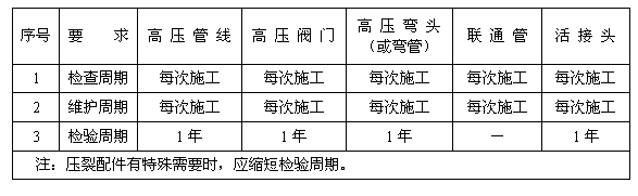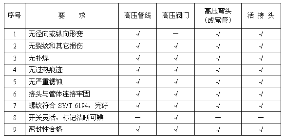 4.5 壓裂用配件應按表1的規定進行檢查、維護和檢驗,并達到表2的要求。達不到表2規定的配件不得使用。