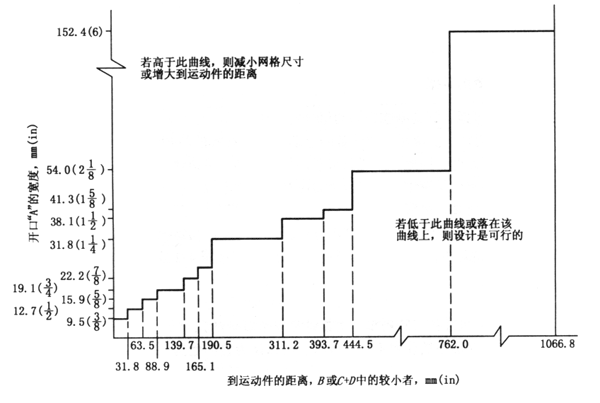 (1)為了提供合理的安全要求,圖4.1給出了防護裝置所允許的最大網格尺寸與距運動部件最大距離之間的關系。這樣,網格最大為6.4mm(1/4in)時,允許距運動部件的距離小于31.8mm(5/4in);網格最大為12.7mm(1/2in)時,距運動部件的距離應為63.5mm(5/2in)或更大;網格最大為22.2mm(7/8in)時,距運動部件的距離應為165.1mm(13/2in)或更大,等等。