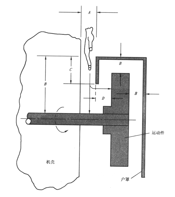 (2)當護罩靠機器一側局部敞開時,如圖4.2所示,護罩距運動部件的距離隨開口“A”的大小而異,應取距離B或距離C+D兩者中的較小者(C+D為護罩靠近機器端的側板深度與該側板外緣到運動部件的距離之和)。