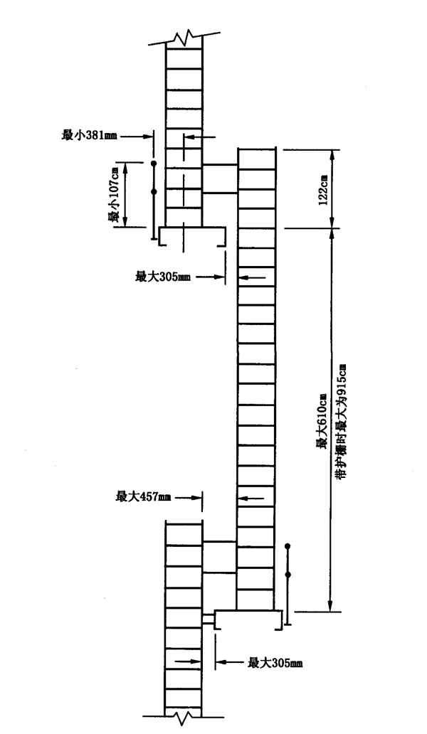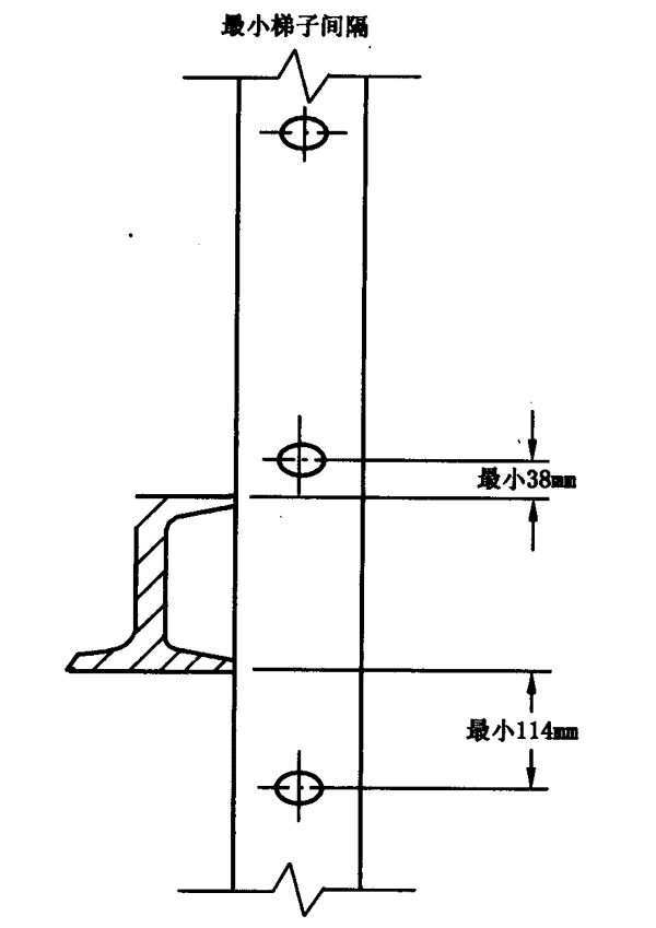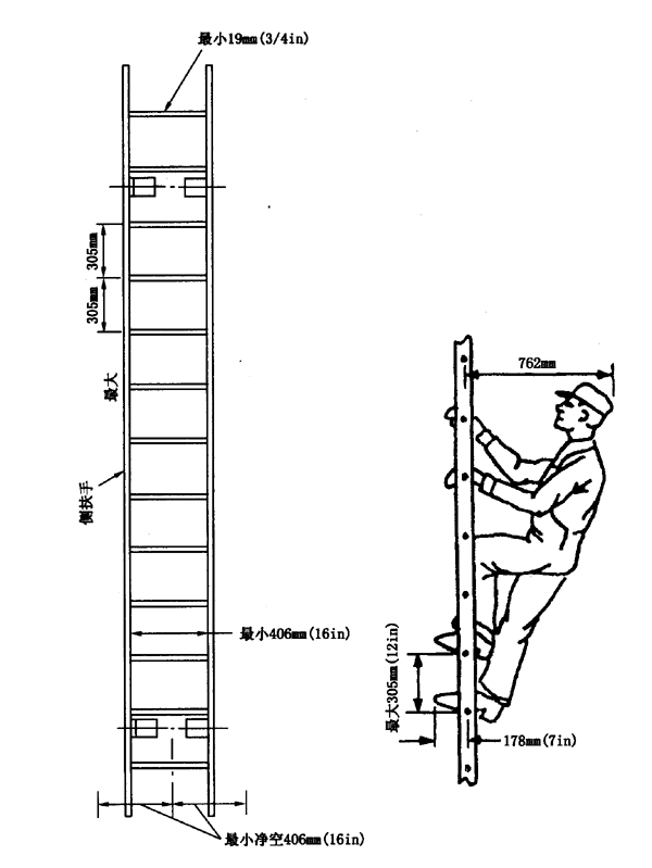 b)外形:所有梯級的最小直徑應為19mm(3/4in),或由至少具有相同強度的其它合適斷面構成。梯級間的中心距不得大于304.8mm(12in),并且沿梯子長度均勻分布。梯級的最小凈長度為406.4mm(16in)。側扶手的斷面應具有足夠的把握面。
