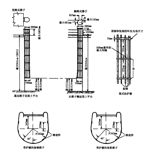 應在護柵的圓周上以不超過40°的間隔設置垂直條板。這樣可保證條板中心距的最大值約為241.3mm(19/2in)。帶護柵的梯子應按附錄A(提示的附錄)中圖A8制造。