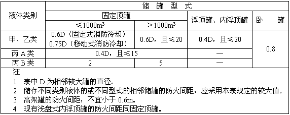 5.1 存儲甲、乙、丙類散裝液貨儲罐的布置、防火間距應按GB 50160—92中5.2的有關規定執行。罐組內相鄰可燃液體地上防火間距見表3。
