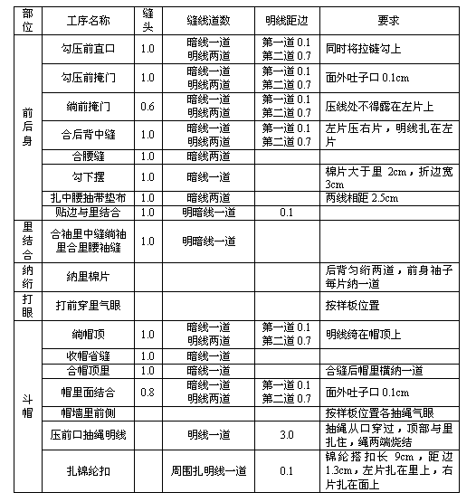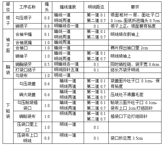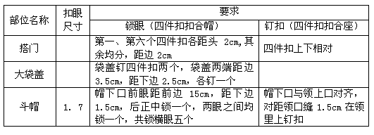 ——拼接:領里許拼兩道,貼邊、前掩門里、大袋蓋里、前后身里、袖里、帽里、胸袋布許拼一道,其余不許拼接。拼接處應避開領口、脖子、圓角、扣眼、省縫等部位。